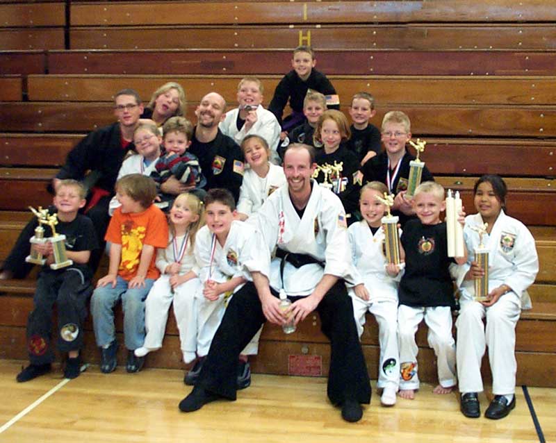 Sensei James, Sensei David, and Sensei Mason pose with the kids from the school with their trophies